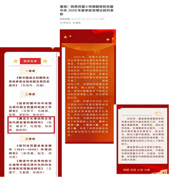 民盟中央开展此次评选活动,旨在系统总结新时代参政党建设规律,强化理论武装、夯实政治共识,为推进中国式现代化提供坚实的统一战线理论支撑和实践指引。民盟陕西省委会层层遴选、严格把关,共有5项课题成果获得表彰,张泽团队成果是其中两项二等奖之一。